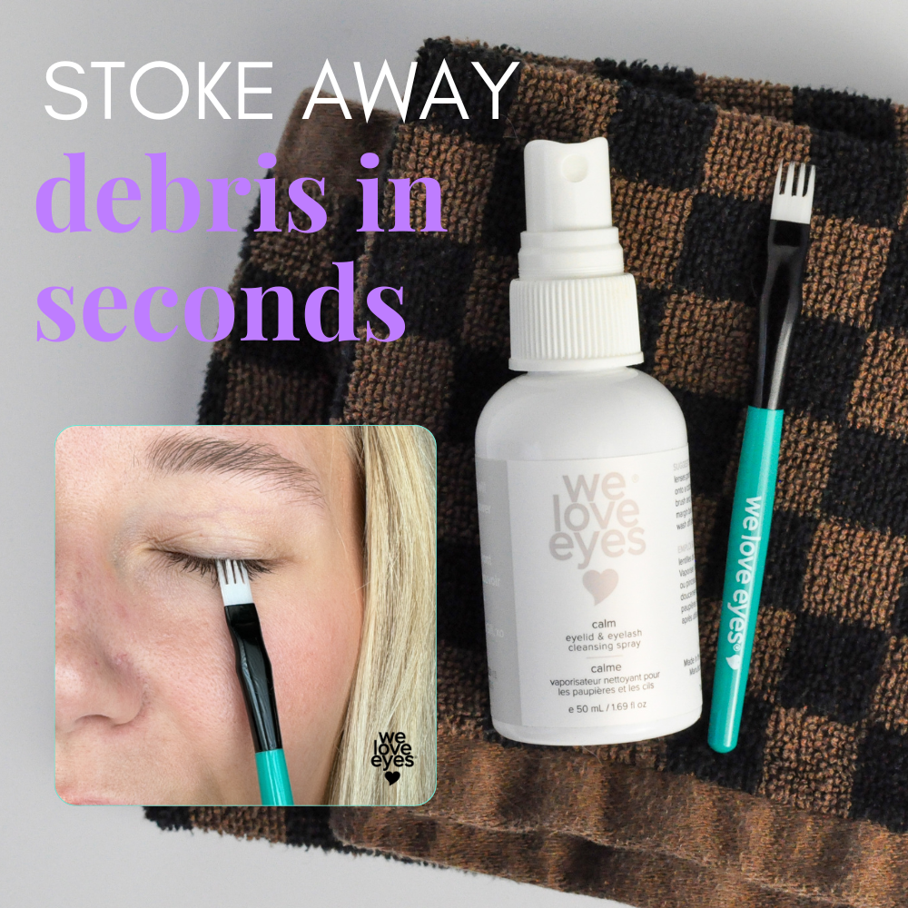 First, heat Focused Eye Roll under running water. Roll across the eyelids for 30 seconds to soften & loosen the debris. Next, saturate In Between Eyelash Cleansing Brush with Calm Eyelid & Eyelash Cleansing Spray. Carefully insert by wiggling the brush into the base of the eyelash. Use the brush to stoke out and dislodge the eyelid debris. Use a 10X lighted magnifying mirror to do this detailed work.