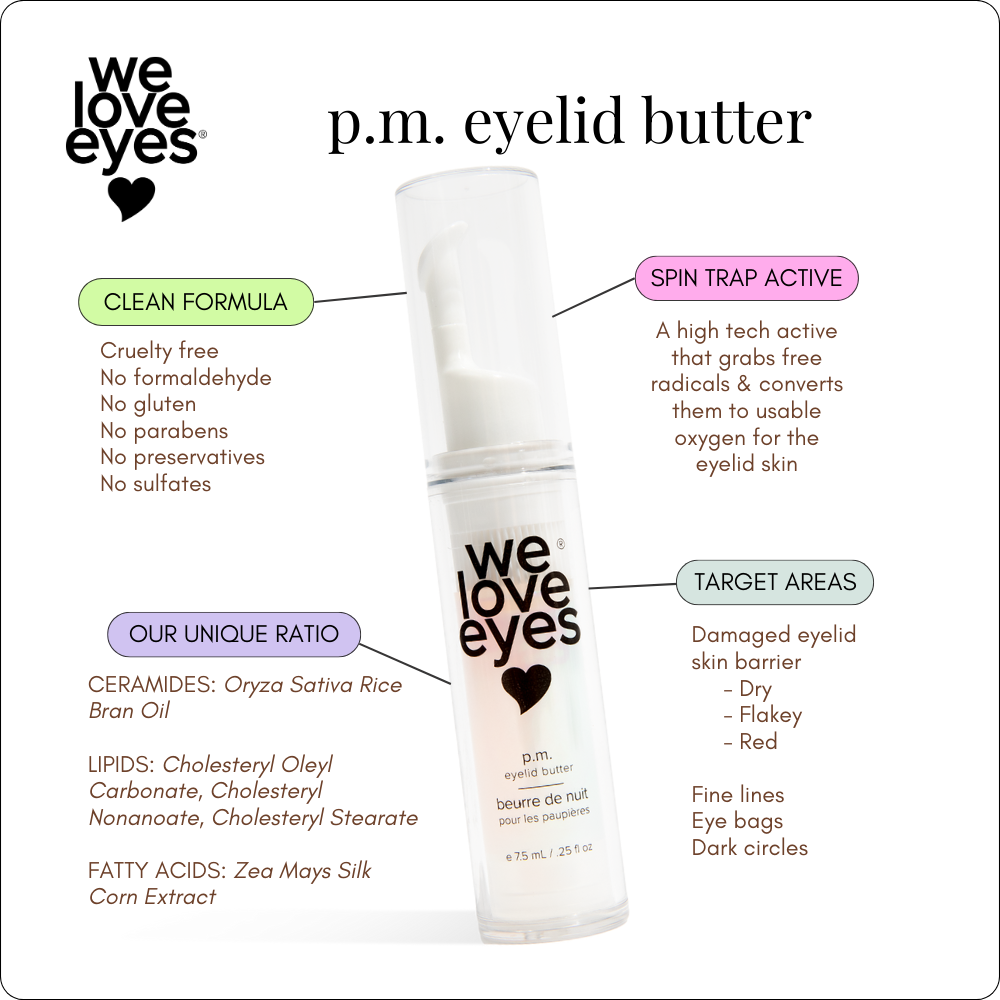 P.M. EYELID BUTTER. Cholesteryl Oleyl Carbonate, Cholesteryl Nonanoate, Cholesteryl Stearate, Oryza Sativa (Rice) Bran Oil, Zea Mays (Corn) Silk Extract, Phenyl t-Butylnitrone (Spin Trap)
