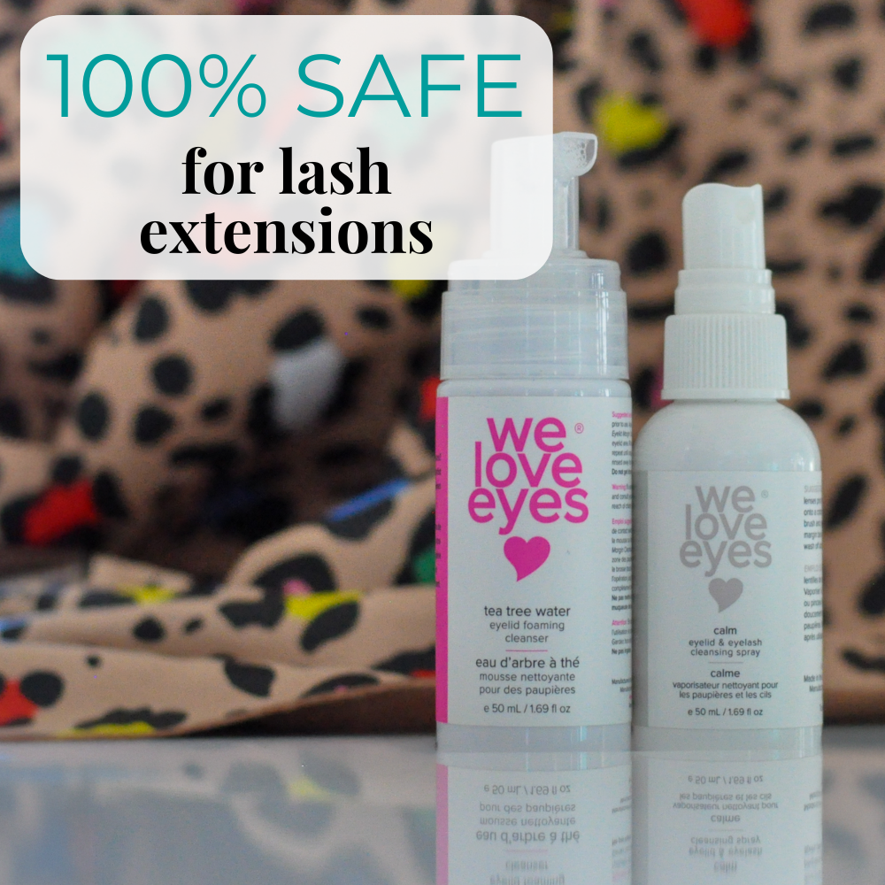 We Love Eyes lash care product with text on extension and lash cleansing.