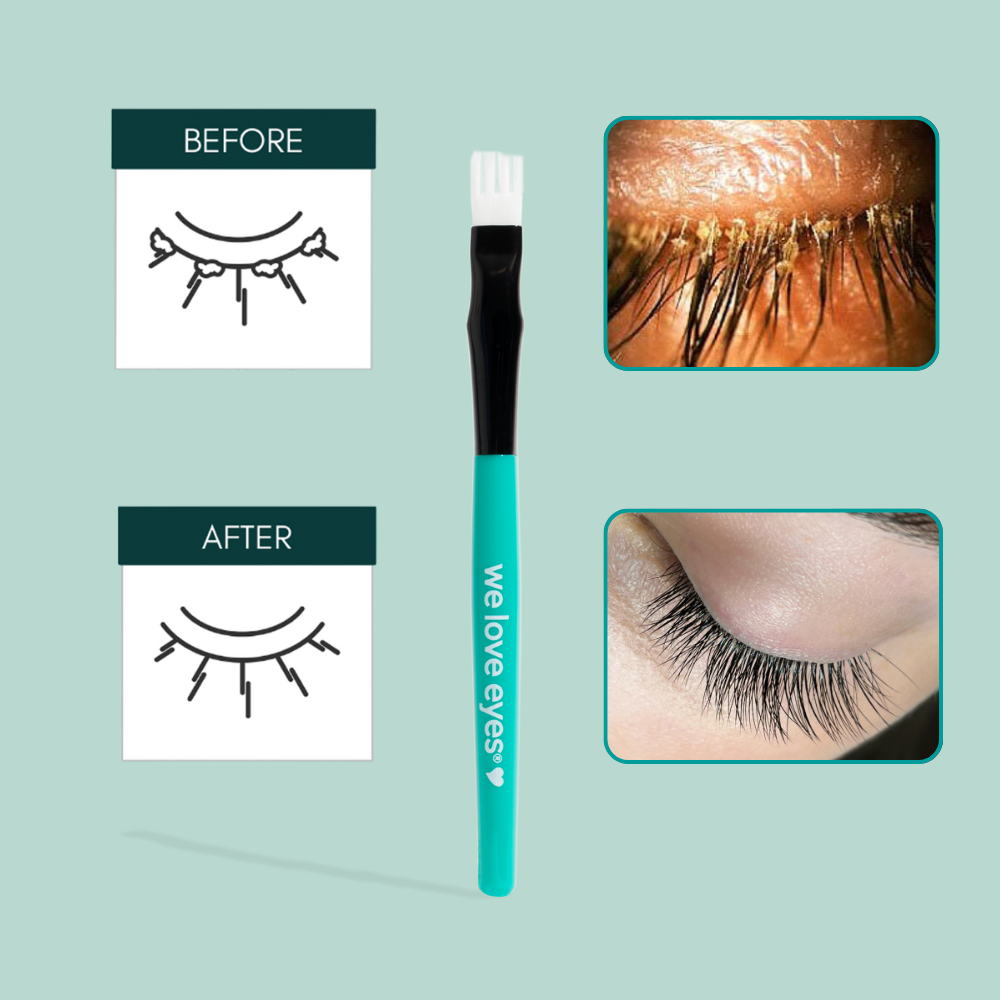 • Cleanse with spray & fork shaped brush to remove lash line debris when it appears