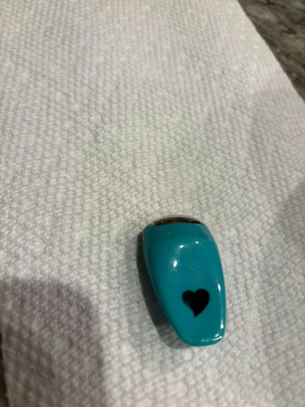 Turquoise bottle opener with heart design on a reflective surface, blurred background